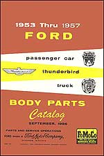 "1953 Thru 1957 Ford Passenger Car, Thunderbird, and Truck Body Parts Catalog." This is a reproduction of the book that originally would have been used in the dealer's parts department so that customers could order body parts.